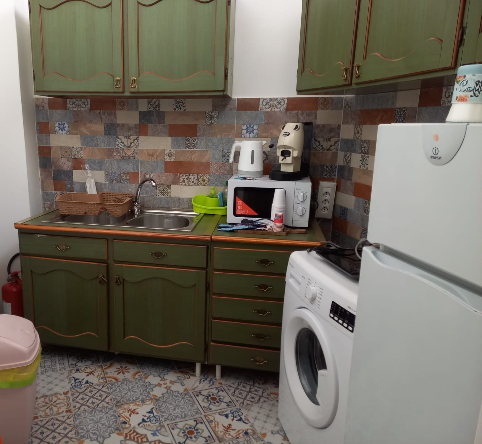 la cucina completa di tutto il necessario la troverete in fondo all’ appartamento e subito prima il bagno completo di doccia e prodotti per il benessere del corpo.